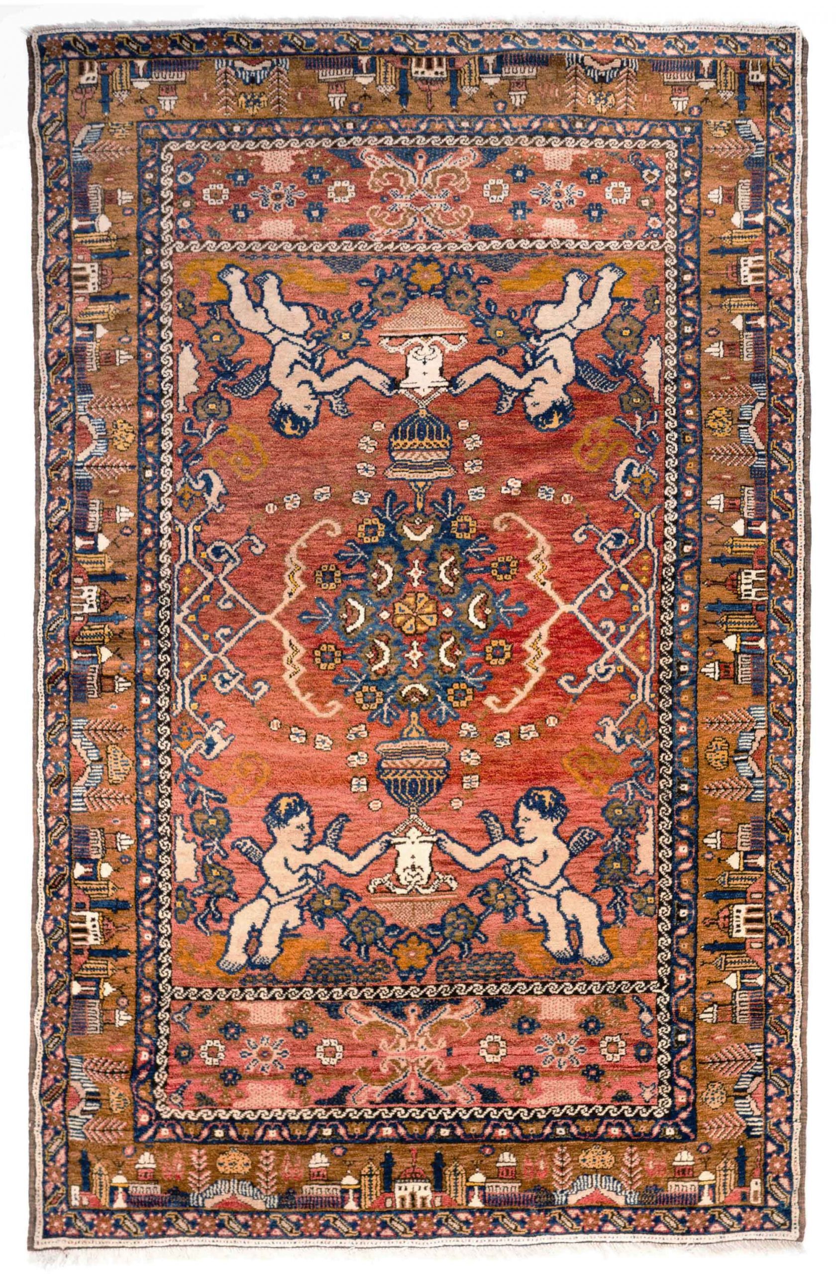 Alfombra única de origen turco. El diseño de la cenefa ( distintos tipos de edificios dispuestos en línea), así como la técnica y colores utilizados, delatan que la pieza fue tejida, con total probabilidad, en Yahyali, ciudad situada en la región de Kayseri (Turquía). La singularidad de la alfombra viene dada por los cuatro ángeles representados, que aparecen en el campo central. En un país de mayoría musulmana, solo un 0,5% de la población se declara cristiana, por lo tanto, entendemos que la autoría de la alfombra debe pertenecer a esta minoría, o a emigrantes procedentes de Armenia o Chipre.