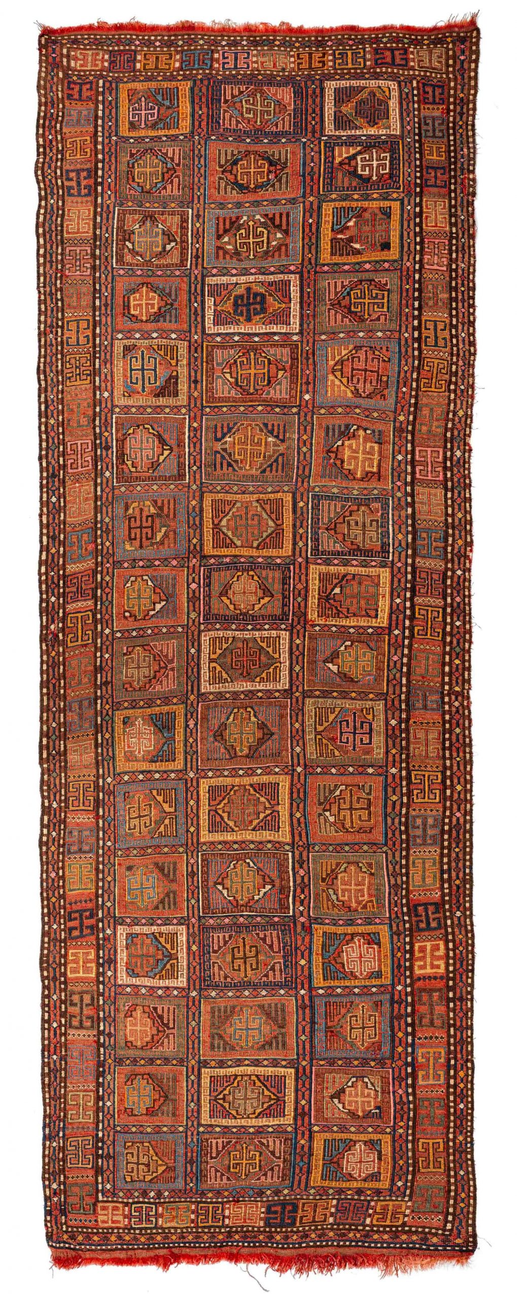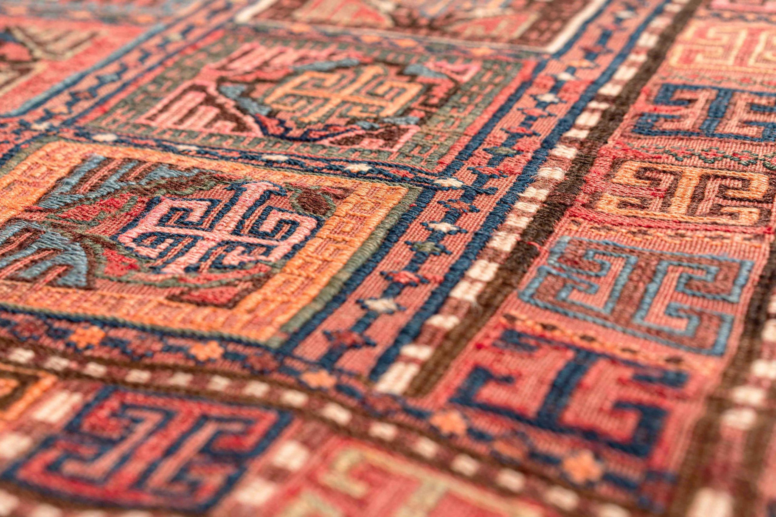 Antigua alfombra soumak de lana y diseño tradicional geométrico. El nombre Soumak hace referencia a una técnica de anudado de tejido plano, que a diferencia de los «Kilims» tradicionales, presentan un cuerpo mucho mas grueso y resistente. «Shahsevan» significa «aquellos que aman al sha » en turco . En el pasado, los Shahsevan tenían un estilo de vida nómada tribal y pastoral, moviéndose durante el verano entre 100 y 200 km al sur en Sabalan y las cordilleras cercanas, en los distritos de Ardabil , Meshginshahr y Sarab.